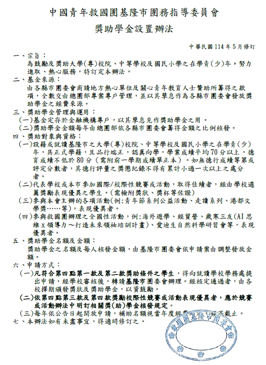 中國青年救國團基隆市團務指導委員會-獎助學金設置辦法